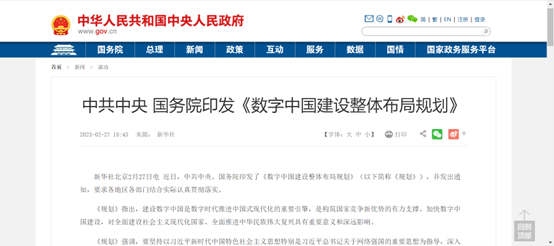近日,中共中央、国务院印发《数字中国建设整体布局规划》(下称“规划”), 提出建设数字中国是数字时代推进中国式现代化的重要引擎,目标是到2025年,基本形成横向打通、纵向贯通、协调有力的一体化推进格局,数字中国建设取得重要进展;到2035年,数字化发展水平进入世界前列。