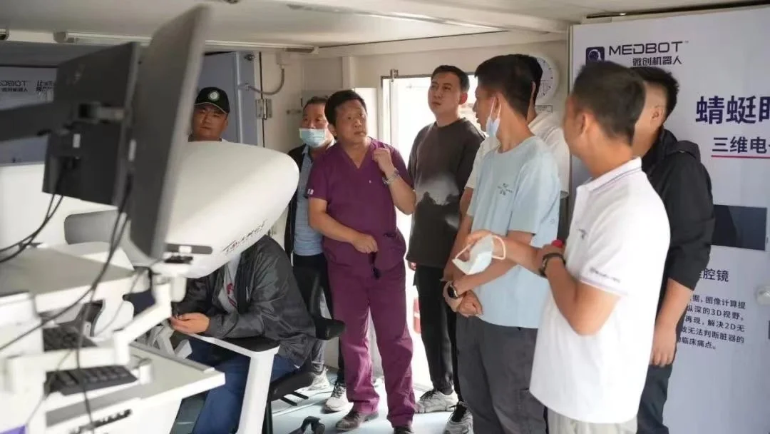 图迈®机器人丝路之行,历时15天,行驶约3000公里,图为沿途医院医护人员热情观摩微创®图迈®5G远程手术