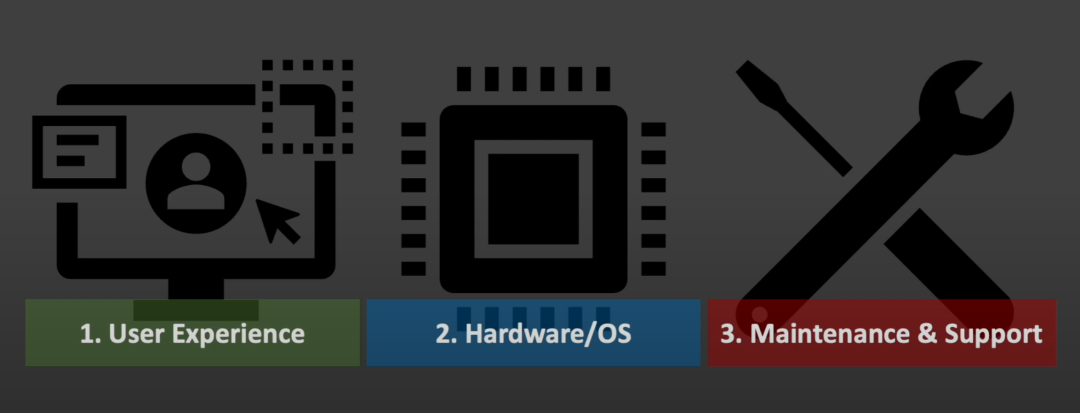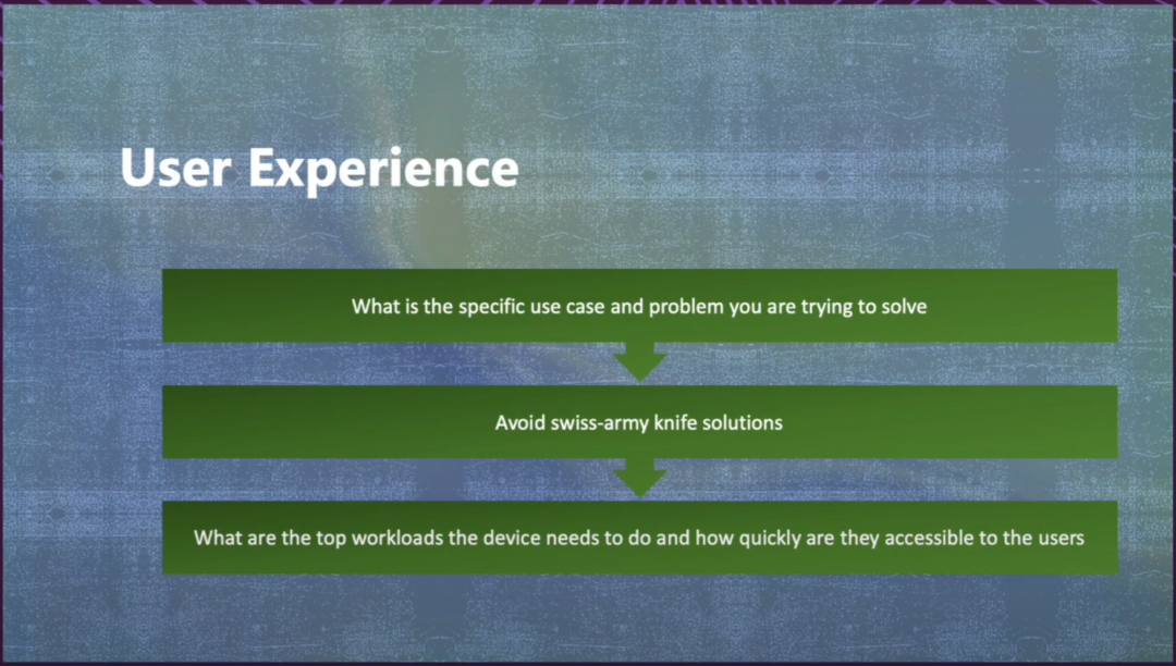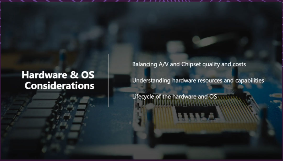 首先,了解用户体验。其次,了解您正在使用的硬件和操作系统,以及它们的能力和限制,比如:它们是否能够真正满足您的用户体验需求?最后,真正深入思考您的维护和支持基础设施以及平台,以便在整个设备的生命周期内能够确保维护和支持。