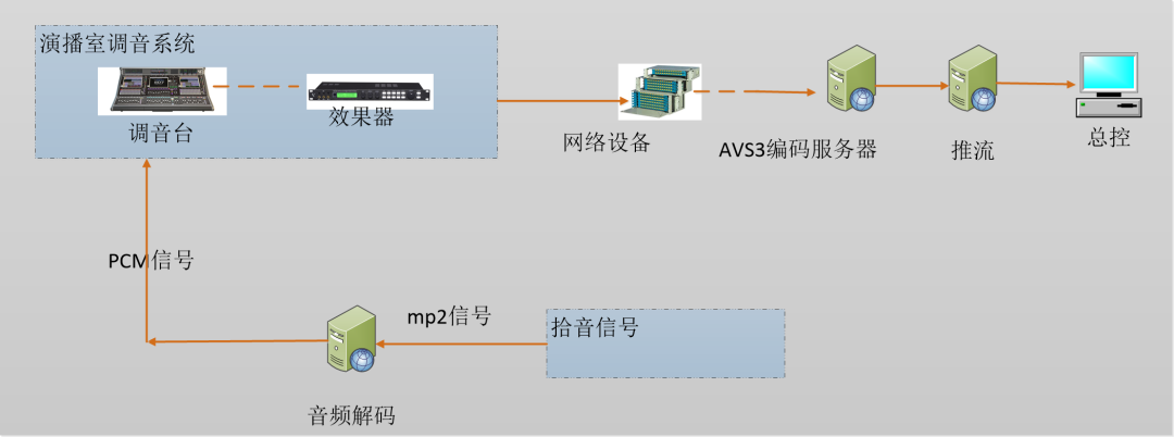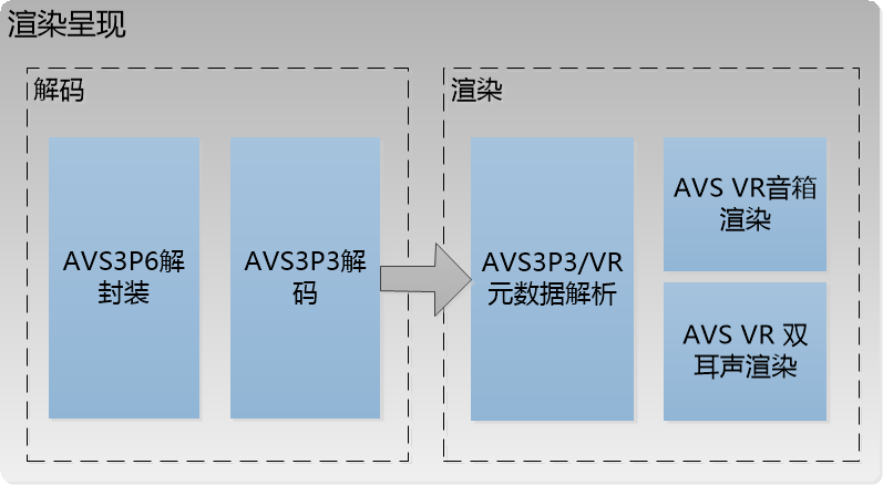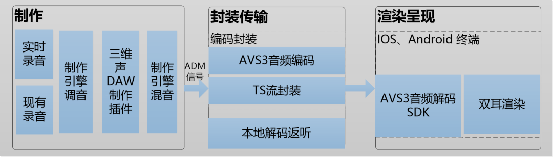 直播系统要支持AVS3音频,系统需要从以下三个环节进行升级,如下图所示,整个直播系统包含三个环节:制作,封装传输以及解码渲染。
