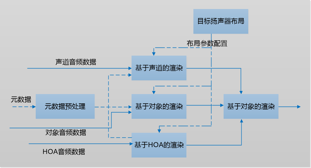 解码的输出包含两个部分:元数据部分和音频部分,为了在用户的耳机中重现赛事现场的三维声音,需要使用双耳渲染技术。顾名思义,双耳渲染的目标是通过对音频进行双耳化处理,将处理后的音频在双耳耳机里进行播放,让用户能够感受到和在真实三维环境里一样具有真实准确方位感的声音。