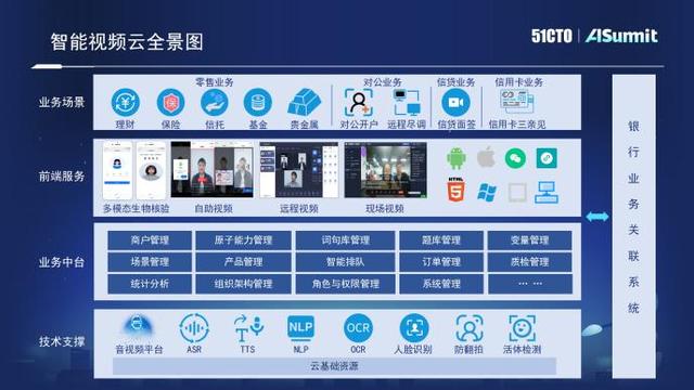 在前端,除了多端介入的支持以外,一系列对于仿冒身份的多模态的生物的核验,客户端的自助和客服的远程视频,以及对现场视频的实时计算和捕捉。最前端是业务场景端,像理财、保险、信托等等一系列的业务所对应的相关线上线下结合的流程办理。