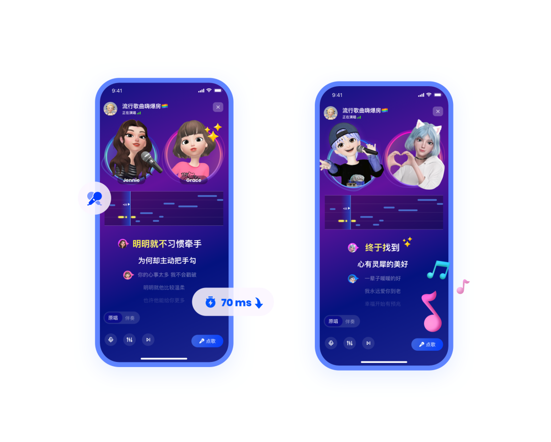 融合了Avatar形象的线上K歌在互动性上更上一层,演唱者的虚拟形象得以完整展示,在演唱表情同步之外,结合服装道具等元素也可以充分表达自我。
