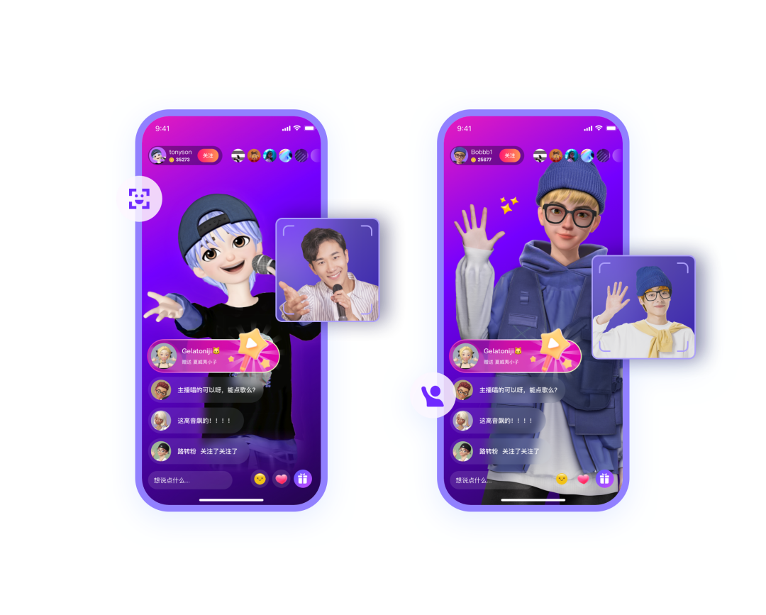 应用了Avatar之后,虚拟主播的变得可萌可御,可呆可燃。其动作、表情、手势都是实时捕捉输出,打破次元壁垒,完美呈现多元形象。同时还可以突破真人主播的限制,让相同背景下的连麦互动触手可及,配合道具及不同场景,也会有更多有趣的直播玩法诞生。