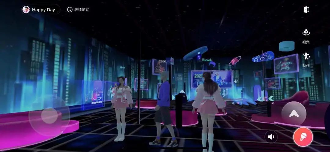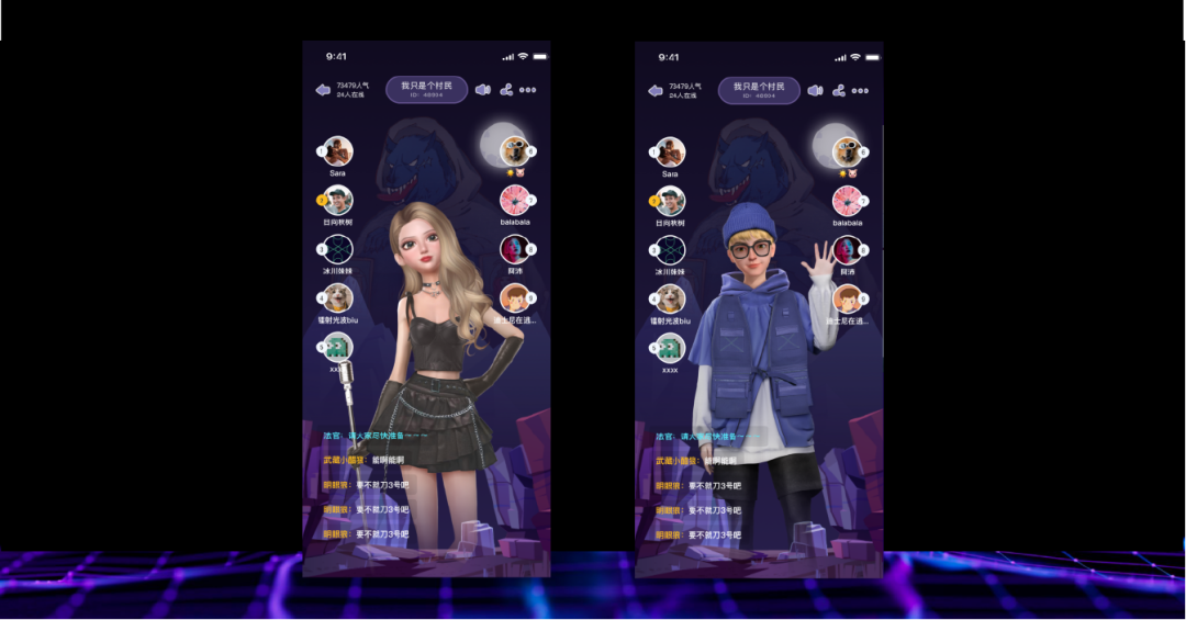 在3D场景下,直播还可以更加有趣,例如通过场景装扮、灯光设置不同的直播场景,观众可以控制虚拟化身移动、互相打招呼、与主播互动等。