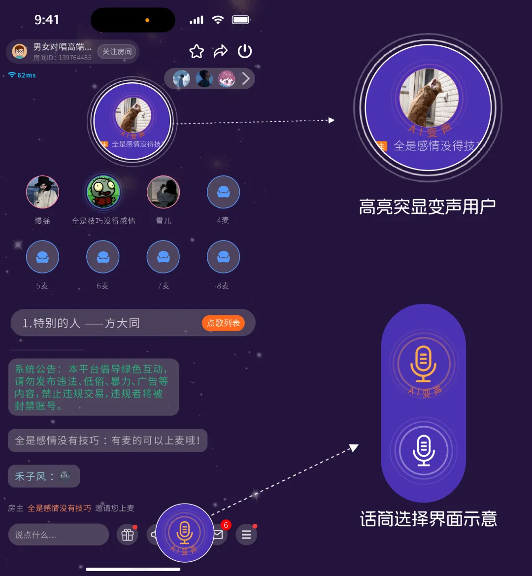 - 神秘人连麦:匿名头像+匿名音色玩法;