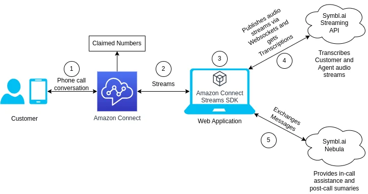 第一个例子是座席接听语音电话的Web应用程序。GenAI 模型会监听对话,并通过利用外部资源(如公司知识库或公开信息),向座席人员建议适当的答案。