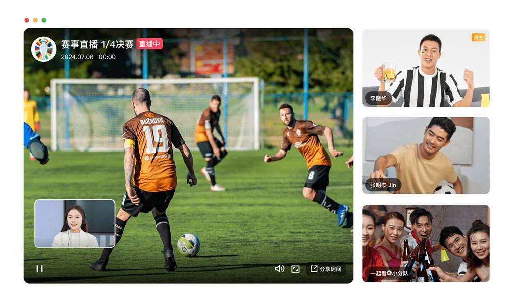 与异地的朋友身处同一个“云包厢”,一起同步看比赛,实时进行音视频通话,讨论赛事。