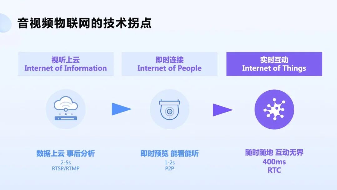 另外,从连接和交互的视角来看,整个音视频物联网的演进可以分为三个阶段。