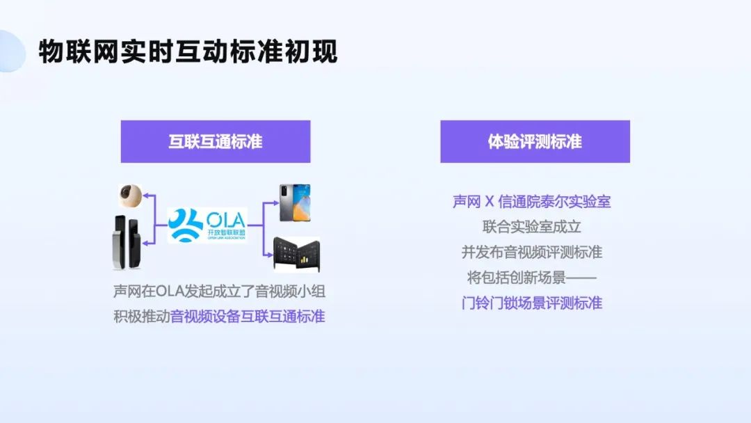 随着实时互动在物联网设备中的逐渐渗透, 实时互动(RTE)和 IoT 的融合成为了有共识的未来赛道,在艾瑞发布《音视频行业白皮书》中,也首次出现了 IoT 行业解决方案的赛道。但正是由于物联网行业玩家较多,所以整个生态也存在着一定的割裂,场景分散依然是行业痛点。在物联网实时互动的标准上,声网加入了国内版的 Meta 开放智能联盟 OLA,并作为音视频小组发起方,积极推动音视频设备互联互通标准方案的落地。除此之外,声网还和信通院泰尔实验室联合建立了音视频评测标准,并且将智能硬件中门铃门锁场景作为创新品类推动评测标准。