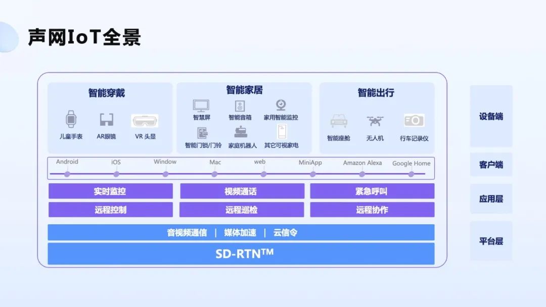 针对行业的趋势变化,声网也在不断地升级 IoT 全景解决方案。面向穿戴、家居和出行等多个音视频设备品类,依托声网的 SD-RTN™ 大网,为智能硬件提供高可靠、低延时音视频流媒体和可靠信令消息能力,开发者可以使用声网 SDK 轻松实现视频通话、远程协作、远程控制、紧急呼叫等功能。