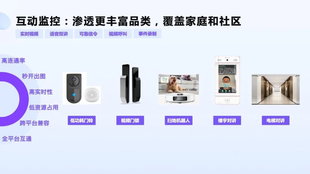 在面向消防安防和民用安防监控场景中,声网提供的实时互动能力,不仅可以满足监控类设备更快、更流畅地实现实时视频和语音双讲能力,还能为这类设备提供视频呼叫、告警消息和事件录制等能力。除了经典 IPC 之外,声网的 IoT 解决方案还覆盖了门铃、门锁、家庭服务机器人、扫地机器人等品类,也衍生到了社区楼宇对讲、电梯对讲等这类设备,能帮助这些场景的功能体验达到 99.9% 的高连通率,毫秒级的秒开出图,400ms 端到端时延和极低资源占用,能让 SDK 在侵入式设备中保持高性价比的体验,同时覆盖包括 WiFi 和 4G 设备的跨平台兼容和互通性,低延时的远程控制通道能力,让设备真正做到不止于看,还能够及时地操控和反馈。