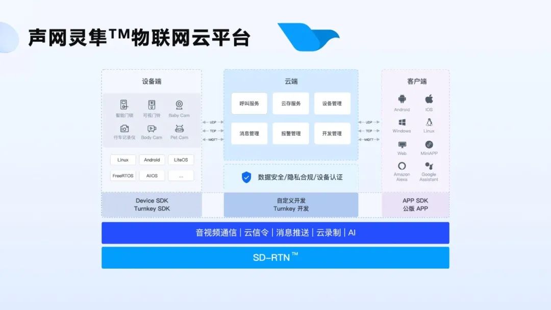 声网灵隼物联网云平台是专门为音视频智能硬件一站式开放而生的一个端到端、低代码平台。该平台有三大优势:一是面向开发者提供更低开发门槛体验,覆盖从宽带流媒体到窄带消息全链路的连接;二是站在终端用户视角,提供更加流畅的视听体验,拥有小于1秒最快出图和行业领先的较低资源消耗,能够做到低时延、快出图;三是面向产业生态提供更加开放的环境,给上游芯片硬件和软件服务,以及方案集成商等上下游产业带来更多的空间。