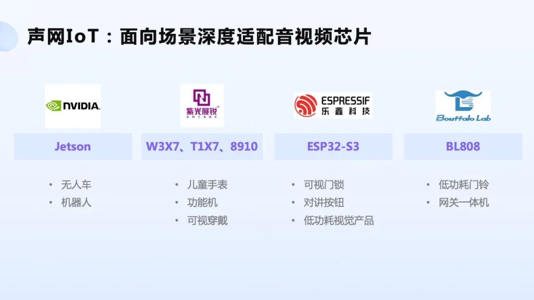 硬件上,面向不同硬件应用场景,声网的 IoT 解决方案深度适配了不同的音视频芯片,围绕产品和平台不断拓展一体化的方案,帮助开发者降低集成门槛。如面向无人车、机器人场景,适配英伟达 Jetson 系列;和紫光展锐平台进行合作,面向儿童手表、功能机和可视穿戴,提供小包体、低功耗的解决方案;基于乐鑫 ESP32-S3 的合作视觉品类方案,可用在门铃门锁和低功耗视觉产品当中。