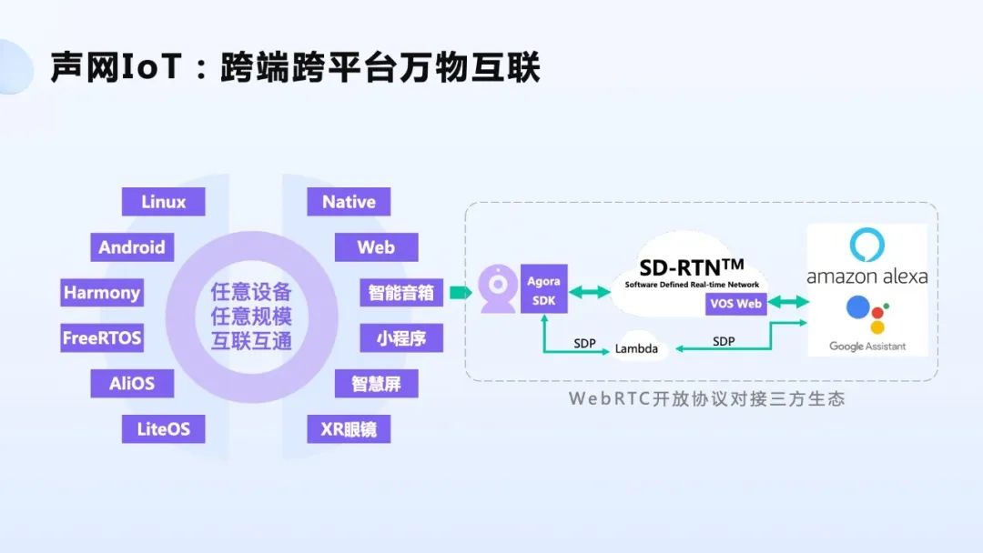 事实上,声网目前已经是一个在 RTC 领域覆盖终端和场景最全的行业玩家,在 IoT 赛道发展过程中,也在不断地打破平台的限制,做到真正跨终端、跨平台的全面互通和万物互联。从主流的 Android 系统到 Linux 系统,甚至像 Harmony、FreeRTOS、AilOS 等小平台都做了全面覆盖和深度适配。今年声网也丰富了设备以及不同媒体形式和 Native、Web、小程序的互通。以海外智能音响为例,通过 Web RTC 开放协议支持,落地了 amazon alexa 和 Google assistant 的互通,帮助出海和海外用户能够在智能家居场景当中,轻松和声网设备互联,这个解决方案也适用于拓展任意标准 Web RTC 的开放平台。