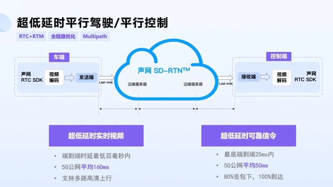 此外,在面向以无人车、机器人为代表一些智能设备远程运维、人工接管和远程控制场景,声网推出超低延时平行驾驶和平行控制方案。针对于同城远程控制,声网解决方案通过标记优先级优化路由调度策略和同节点转化方式,保障该场景下的延时传输质量。同时还结合了多运营商物联网卡场景下,通过 Multipath 多路径融合的技术,保证网络质量的可用性和弱网对抗能力。实测数据显示,从无人驾驶车辆摄像头画面采集,到远程控制台显示,声网能做实时音视频端到端时延最低百毫秒内,5G 公网平均 160ms;可靠信令可以做到端到端 25ms 之内,5G 公网平均 50ms,可以保障低速自动驾驶车辆在 30 公里时速下,拥有相对可靠、安全和高效沉浸式的体验,来完成所有的远程作业。