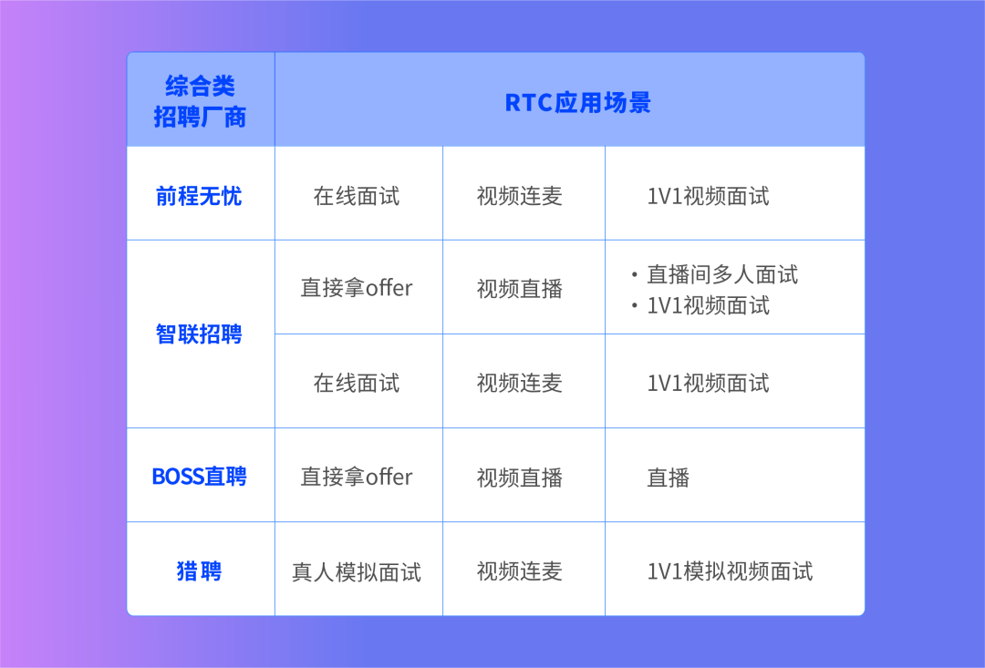各家产品根据自身的业务选择不同的RTC应用场景:前程无忧主要采用1v1视频面试形式;智联招聘主要采用直播拿Offer和1V1视频连麦这两种形式;Boss直聘主要为直播拿Offe的形式;猎聘网主要为真人模拟面试,以视频连麦的形式,模拟1v1视频面试。