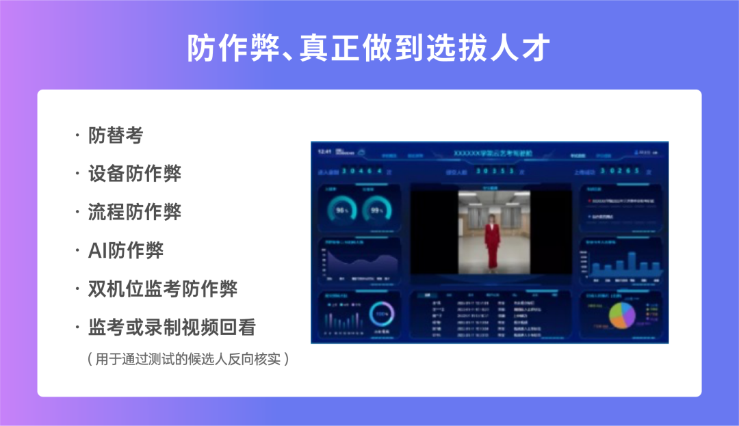 此外,“小艺帮”在防作弊流程方面层层把控,助力招聘单位真正选拔人才,比如,录制人脸验证,确保本人考试;考试设备上多重防作弊机制;考生画面AI检测、操作轨迹全程记录,全方位防范作弊风险等等。