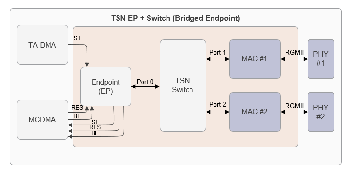 当前,想要实现TSN 就需要一种能在网络终端和交换机上提供低时延和确定性响应的解决方案。一款适合的平台需包括以太网 MAC、TSN 桥和 TSN 终端逻辑(图 1),此外还要借助软件来处理网络同步、初始化以及与网络配置控制器的接口连接等功能。