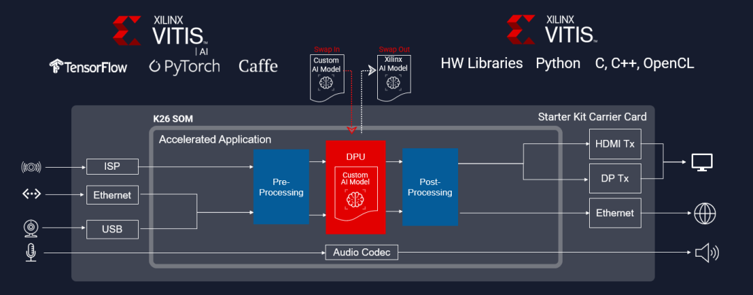 图 2:采用 SOM 和业界标准框架开发机器学习应用。Vitis™ AI 工具提供了丰富的深度学习处理器单元( DPU ),可作为可参数化的 IP 核,直接实现在 SOM 可编程硬件中(图 2)。KV260 视觉 AI 入门套件等入门套件包括利用 Vitis DPU 的 AI 加速应用。