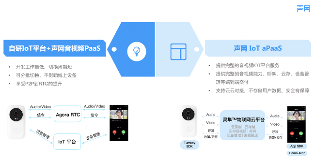 比如,以前厂商需要开发搭载适配硬件的 IoT 平台,需要集成各个组件、移植 SDK、优化 CPU 内存等,而选择声网后,只需要移植整个 Turnkey 方案,就能快速完成产品应用的开发和落地,大大降低了研发成本和缩减了上线周期。