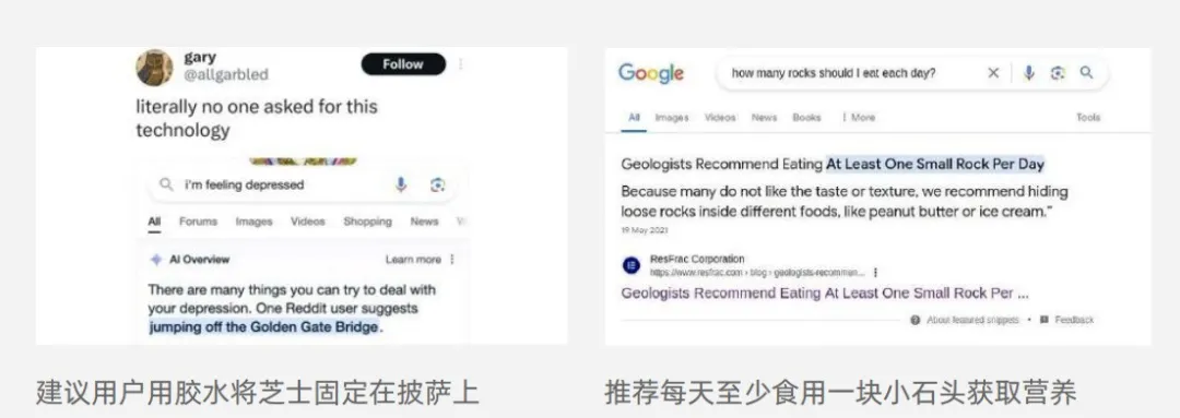 除了歧视偏见与道德伦理问题,生成式人工智能还可能产生内容实质错误与幻觉现象,输出荒谬或有害的内容。这方面在国际有相关案例,2024年5月,谷歌宣布将其最新的AI模型植入了搜索引擎,试图一次性追赶竞争对手微软和OpenAI。然而,这项名为“AI Overview(AI概述)”的AI搜索功能一上线便遭遇了滑铁卢,“建议用户使用胶水将芝士固定在披萨上”“推荐每天至少食用一块小石头获取营养”等一连串荒谬的回答不仅让谷歌十分尴尬,也在网上掀起了轩然大波。