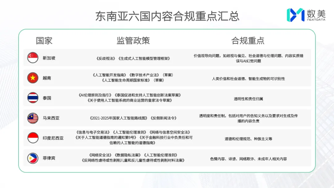 东南亚作为全球经济快速发展的区域之一,人工智能行业也展现出蓬勃的发展势头。东南亚各国在政治、文化、法律制度等方面具有鲜明的区域特性,不同国家的法律框架、AI合规相关的法规、伦理标准以及政府监管政策等方面都需要特别关注和遵守,以确保技术创新与法律规范的有机结合。生成式AI 的法律监管和合规要求也同样符合区域和各国的独特性要求。