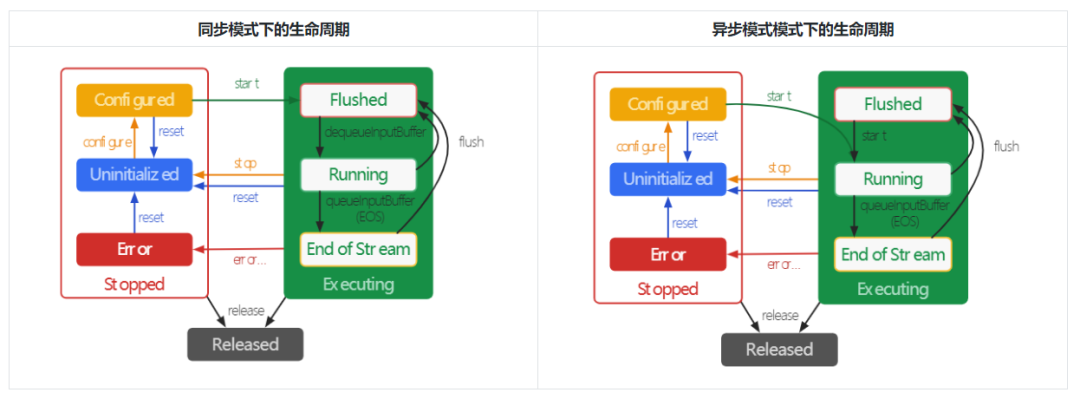 如上图所示,三种状态的切换都是由 start、stop、reset、release 等触发,根据 MediaCodec 处理数据方式的不同,其生命周期会略有不同,如在异步模式下 start 之后立即进入 Running 子状态,如果已经处于 Flushed 子状态,则需再次调用 start 进入 Running 子状态,下面是各个子状态切换对应的关键 API 如下: