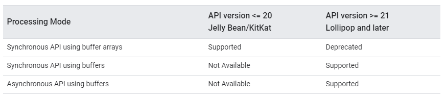 每个创建已经创建的编解码器都维护一组输入缓冲区,有两种处理数据的方式,同步和异步方式,根据 API 版本不同有所区别,在 API 21 也就是从 Android5.0 开始,推荐使用 ButeBuffer 的方式进行数据的处理,在此之前只能使用 ButeBuffer 数组的方式进行数据的处理,如下:
