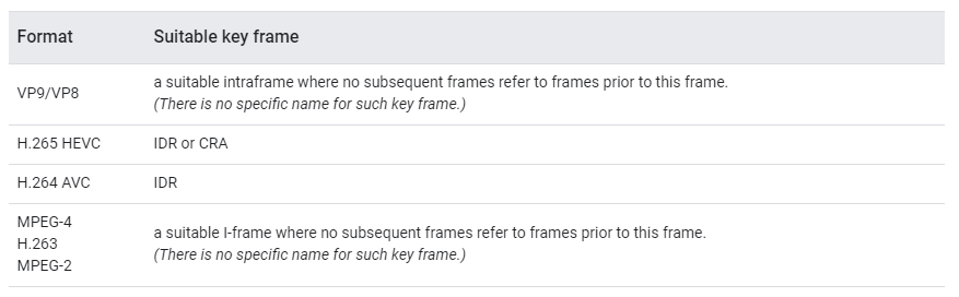 此时只有在将解码器配置在 Surface 上解码时,自适应播放的功能才会被激活,视频解码时当 strat 或 flush 调用后,只有关键帧(key-frame)才能完全独立解码,也就是通常说的 I 帧,其他帧都是据此来解码的,不同格式对应关键帧如下: