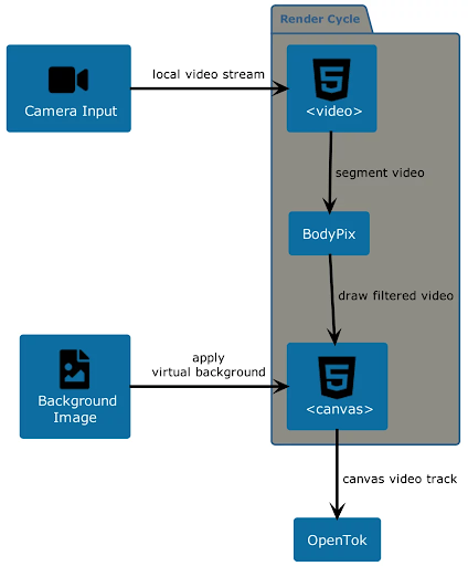 然后您需要一个中间<canvas>元素,您可以在其中绘制新背景和机器学习模型识别为人物的像素。您还需要使用诸如 requestAnimationFrame 或 setTimeout 之类的东西来更新<canvas>新的视频帧。