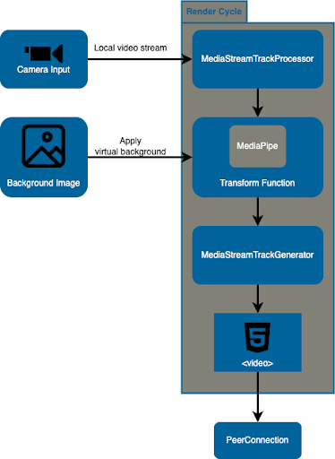 接下来,您将 传递MediaStreamTrackProcessor给一个转换器函数,在该函数中应用您想要的自定义(在我们的例子中使用 ML 库(例如 MediaPipe 删除背景并将其替换为自定义背景图像)并将结果写入MediaStreamTrackGenerator.