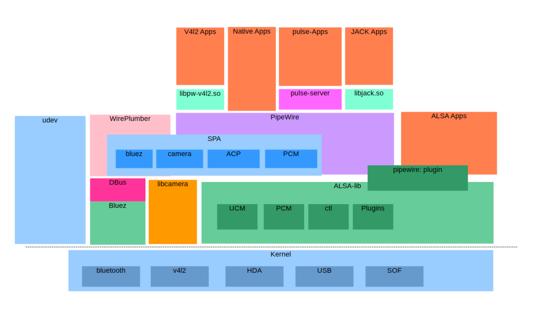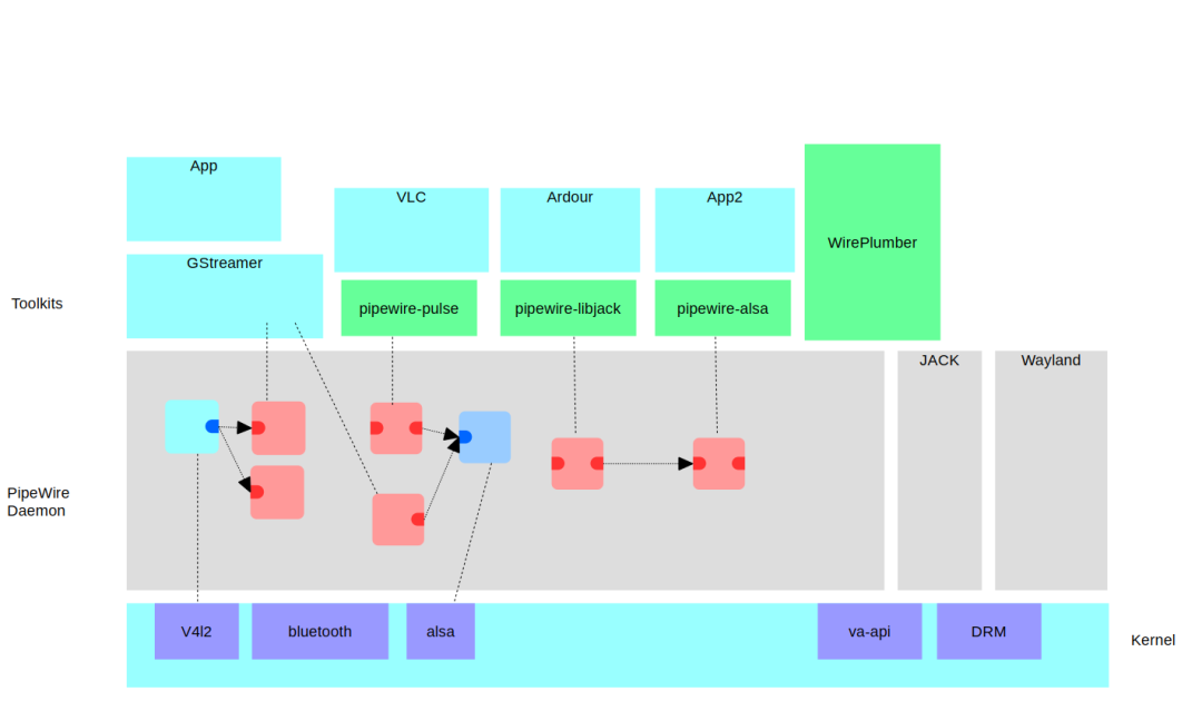 它位于用户空间 API 访问内核驱动和应用程序之间,作用类似于 PulseAudio 或 JACK,但也包括视频设备、MIDI、Firewire 和蓝牙。它允许应用程序相互之间或与设备之间进行媒体交换。
