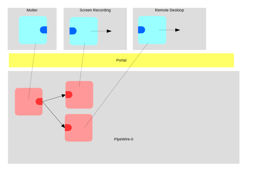 在 Wayland 下,考虑到安全性原因,屏幕的内容无法被直接抓取。这使得在 Wayland 之上实现屏幕共享或远程桌面需要一些额外的工作。GNOME 实现了一个 portal(DBus API)用来请求一个 PipeWire 的桌面流。portal 会询问用户要激活哪种屏幕共享(窗口、区域或整个桌面以及显示器等),然后建立一个 PipeWire 会话。会话的 fd 被传递给应用程序。使用 PipeWire 的安全模型时,只有这个流对应用程序是可见的,数据可以在合成器和应用程序之间传输。