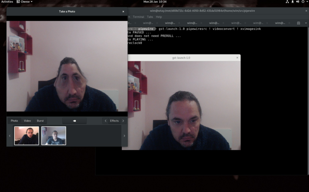 下图显示了 Cheese 和 GStreamer 管道共享通过 PipeWire 提供的 video4linux 摄像机捕获的视频: