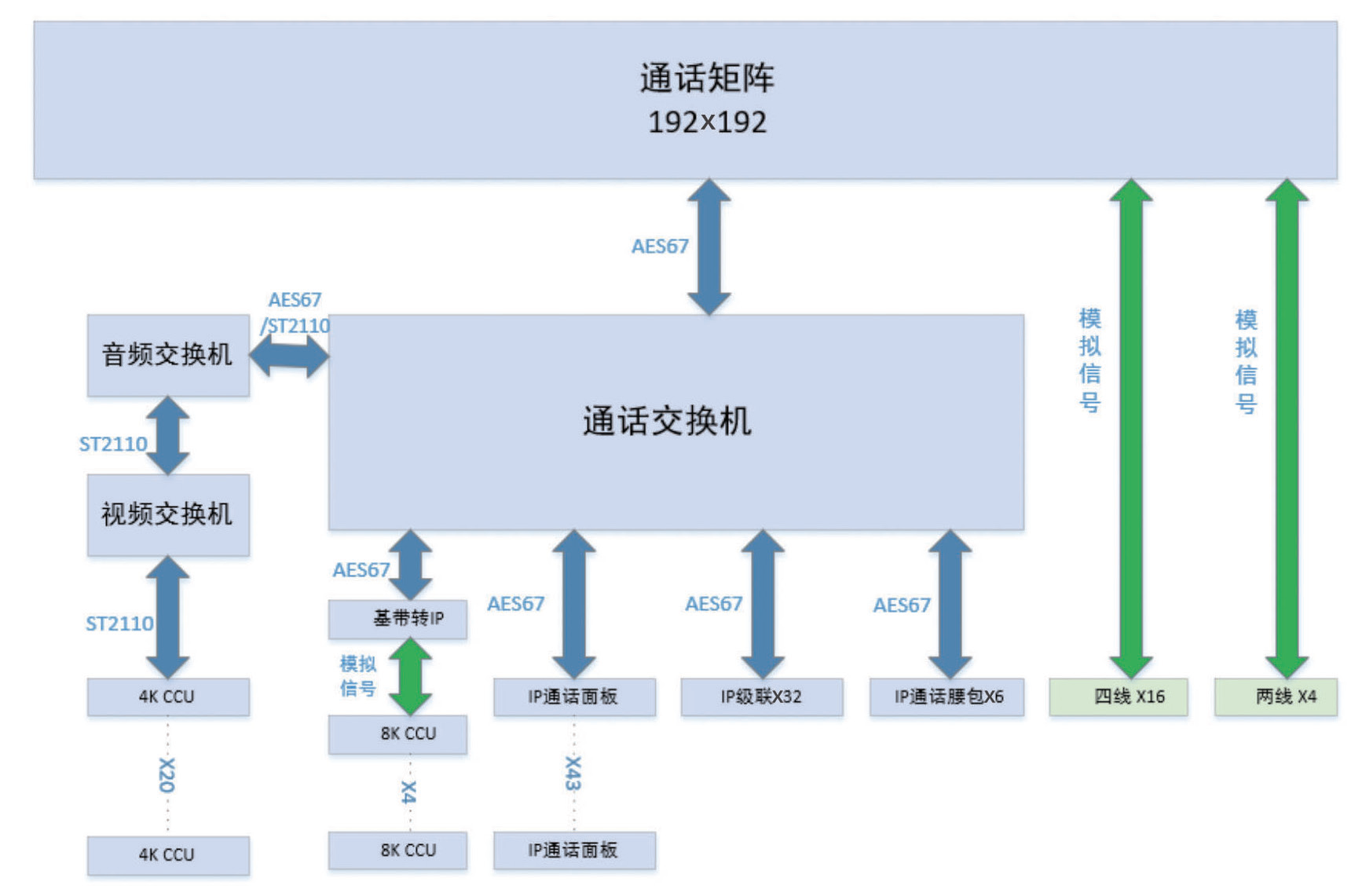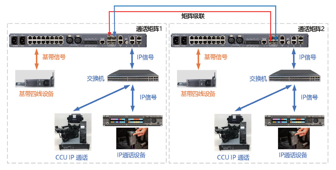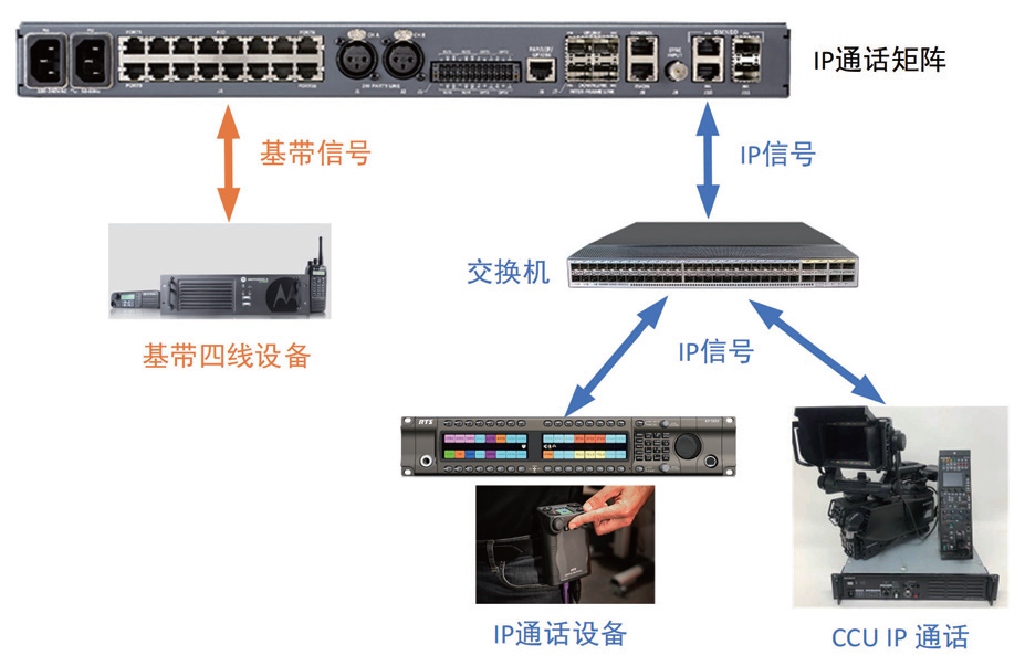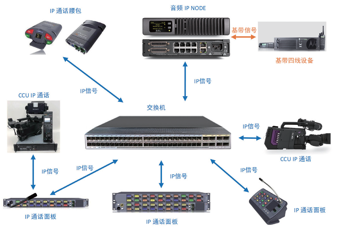 目前IP 通话系统的架构还是以实体通话矩阵为 处理核心,由交换机负责对信号进行分发。摄像机机 头、IP 通话面板、IP 通话腰包、无线通话设备以及 部分两线/ 四线基带通话设备作为通话系统与各工位 操作员之间的交互设备。