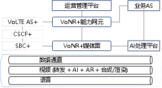 移动通信运营商4G VoLTE(Voice over LTE)业务已实现全网商用,5G通信诉求也从语音通信逐步过渡到视频通信。VoNR用户对视频通话提出了更高要求,除高质量音视频通信外,还包括更加智能、更具交互性的服务体验。5G VoNR+网络基于VoLTE/VoNR网络升级,通过引入VoNR+能力网元、VoNR+智能媒体面人工智能(Artificial Intelligence,AI)处理及运营管理功能,打造了全新的视频通话基础架构(如图1所示),并将催生5G通话的新业态新模式。
