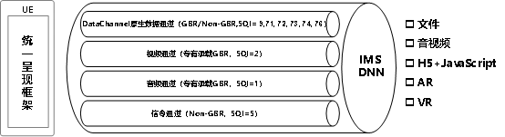 VoNR+借助IMS数据通道(IMS Data Channel)技术,在语音通道、视频通道之外,增加了一条数据通道(如图2所示)。VoNR+网络侧针对音视频通道业务进行分层编码和传输,并提供不同的5QI(5G QoS Identifier)进行QoS保障;针对数据通道业务,识别不同的数据包并以更细粒度实施QoS控制,引入新的QoS参数以支持触觉数据或传感器数据传输。数据通道可伴随通话传递位置、图片、文字,甚至是听觉、视觉、触觉、动觉、环境信息等更丰富的交互信息,将通话从单一话音升级为多媒体形式。
