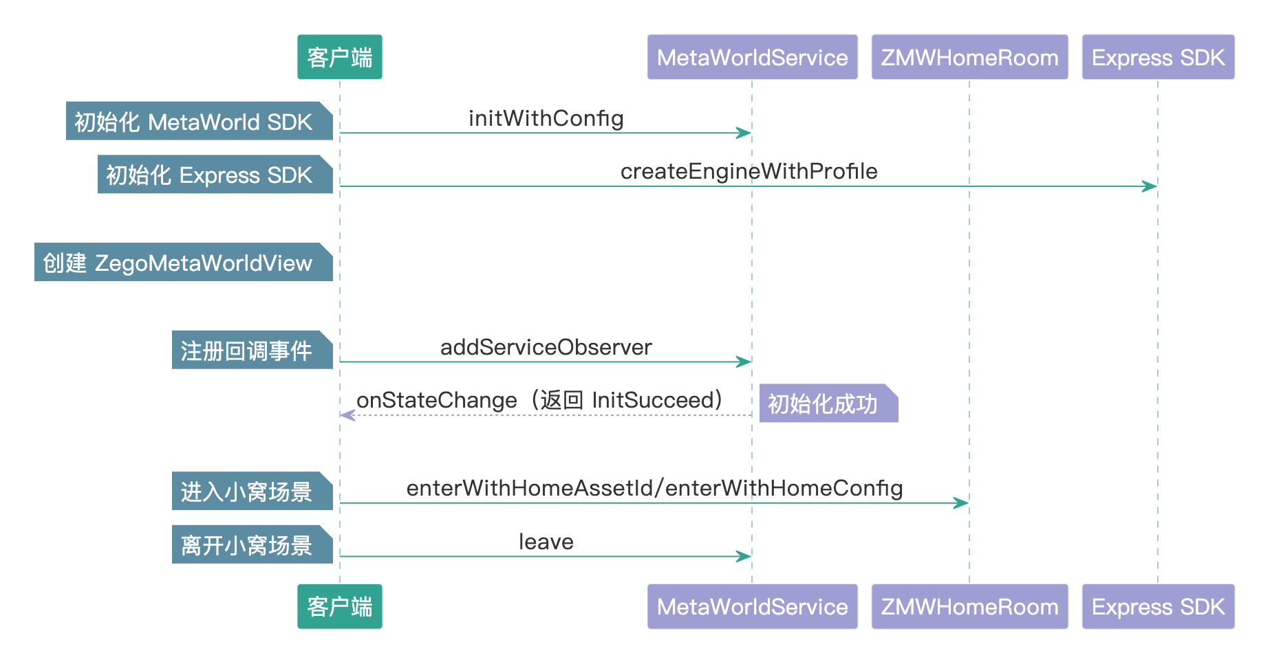 其中,通过 ZEGO MetaWorld SDK 对 Express SDK 进行了封装,实现了业务逻辑的内部调用。