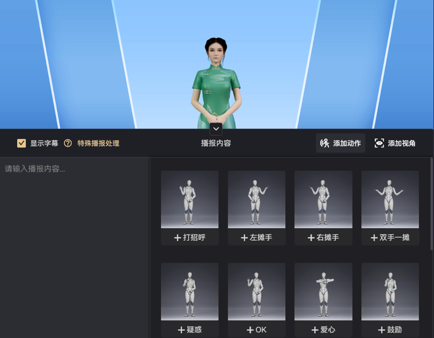 虚拟人的驱动方式采用TTS方式(根据文本或语音输入生成虚拟人的语音、表情、动作),可根据名人表达内容的含义、情绪,驱动虚拟人做出对应的动作与表情,使名人的虚拟人更契合他当下的情感表达。
