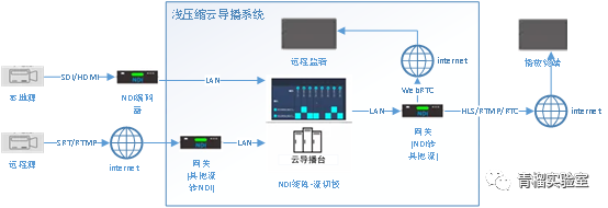 - 远程视频源,通过传统流媒体协议RTMP/SRT等,通过互联网,连接接入网关,网关进行协议转换,通过局域网,传输NDI信号给导播台;