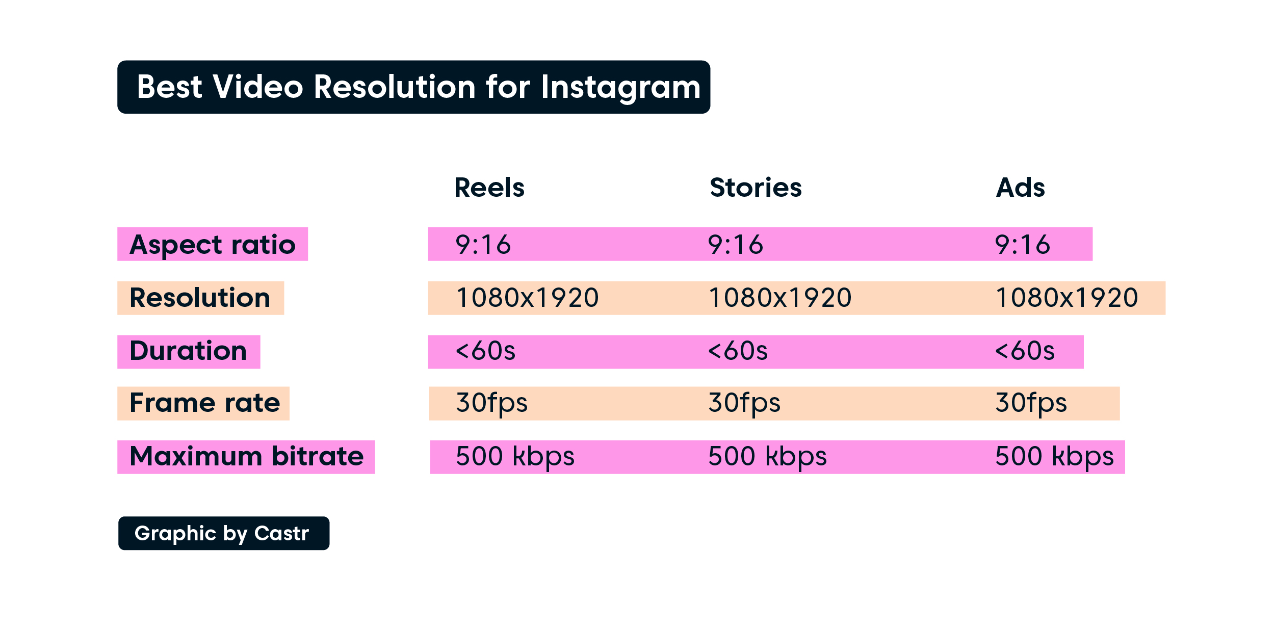 为确保在 Instagram 上的信息流视频和信息流视频广告获得最佳观看体验,请使用符合纵横比和文件大小限制的最低视频分辨率上传视频。此外,确保 Instagram 视频的宽度至少为 500 像素。对于 Instagram 上的轮播广告,建议尺寸为 1080 x 1080p,而最小尺寸为 600 x 600p。