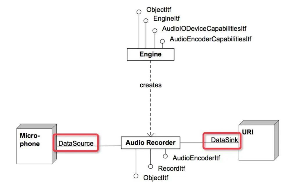 SLRecordItf 和 SLPlayItf 分别抽象多媒体功能 recorder 和 player ,通过 SLEngineItf 的 CreateAudioPlayer 和 CreateAudioRecorder 方法分别创建 player 和 recorder 对象实例。
