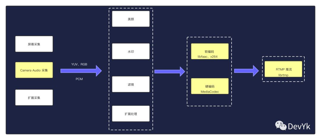 咱们回顾一下前面 2 篇文章,主要讲解了如何搭建 rtmp 直播服务器,和如何开发一款具有拉流功能的 Android 播放器。那么现在有了播放端和直播服务器还缺少推流端。该篇文章我们就一起来实现 Android 端的 rtmp 推流,想要实现 Android 端推流必须要经过如下几个阶段,见下图: