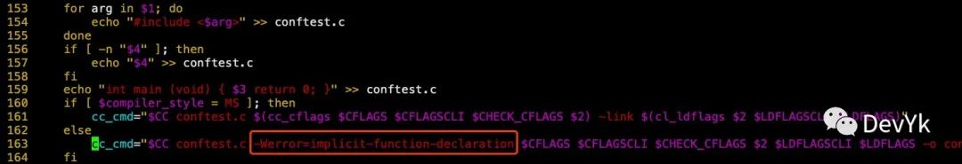 在编写脚本之前需要在 configure 中添加一处代码 -Werror=implicit-function-declaration,如下所示: