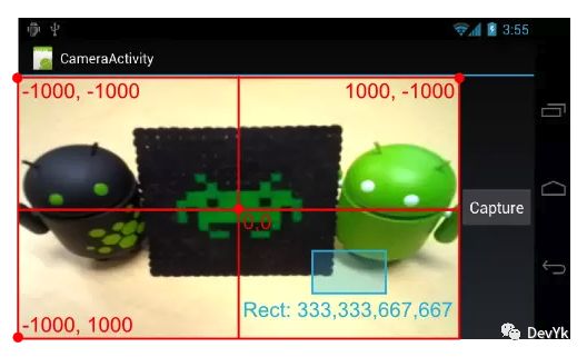 对于自动对焦这样设置后就完成了工作,但是对于触摸对焦则需要设置对应的对焦区域。要准确地设置对焦区域,有三个步骤:一、得到当前点击的坐标位置;二、通过点击的坐标位置转换到摄像头预览界面坐标系统上的坐标;三、根据坐标生成对焦区域并且设置给摄像头。整个摄像头预览界面定义了如下的坐标系统,对焦区域也需要对应到这个坐标系统中。