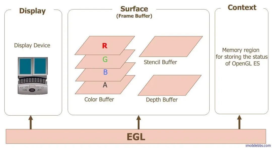 Surface(EGLSurface)是对用来存储图像的内存区域 FrameBuffer 的抽象,包括 Color Buffer(颜色缓冲区), Stencil Buffer(模板缓冲区) ,Depth Buffer(深度缓冲区);
