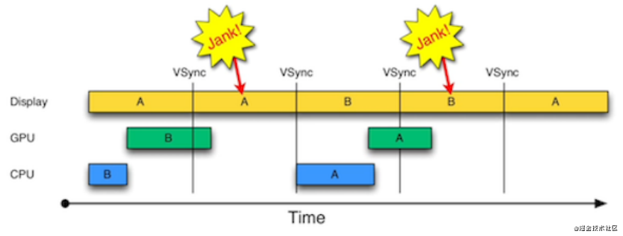 由于垂直同步的机制,如果在一个VSync时间内,CPU或者GPU没有完成内容提交,则那一帧就会被丢弃,等待下一次机会再显示,而这时屏幕会刷新显示上一帧的内容。
