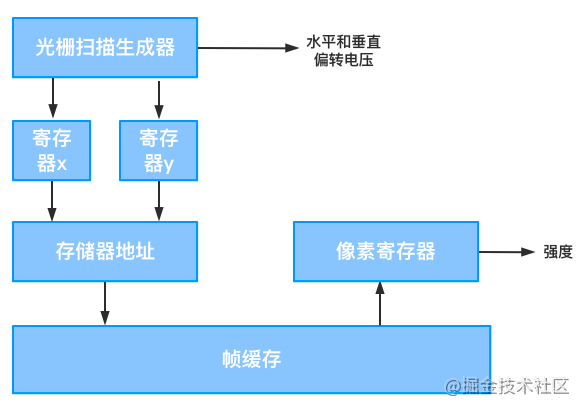 在光栅扫描显示中,电子束横向扫描屏幕,一次一行,从顶到底依次进行。电子束在屏幕上逐点移动时,从被称为帧缓存的存储区取出每个像素点的强度值控制其显示状态。