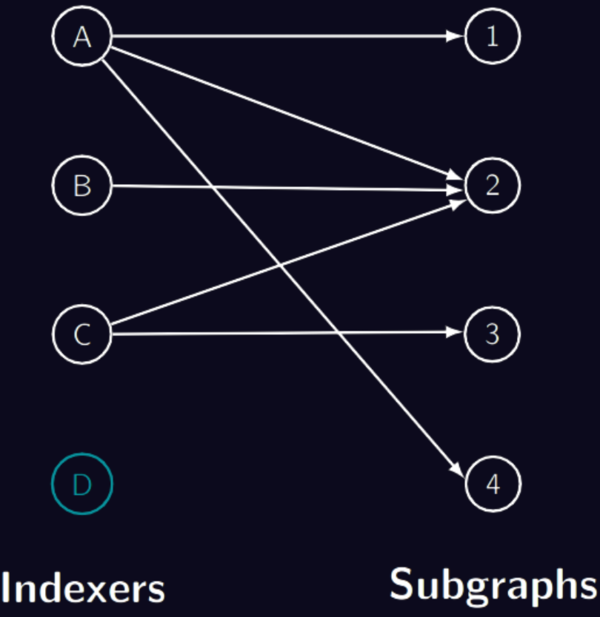 Graph Network 目前部署了 750 多个子图。在消费者可以进行子图查询之前,索引器必须“同步”与子图相关的区块链数据,然后将 GRT 分配给子图。同步子图然后提供查询是一项非常耗费资源的任务,因此索引器通常不会同步所有子图。实际上,Graph网络看起来类似于下图,索引器仅分配给许多可能的子图中的一些: